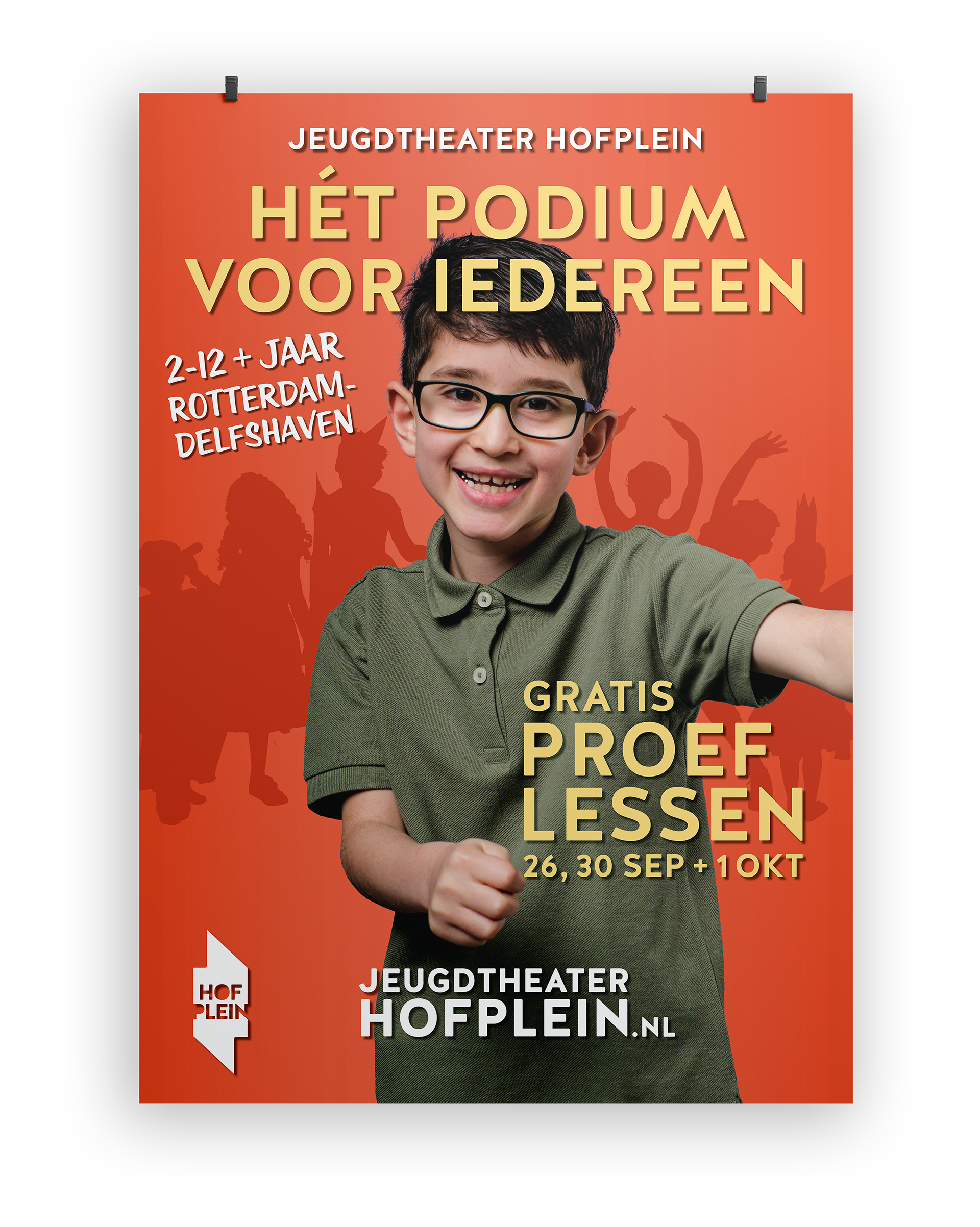 The second project that stood out was a series of posters I designed for the Hofplein Jeugdtheater. This youth theater based in Rotterdam created a campaign to inform people about the free try-out classes that they organize throughout The Netherlands. The client hired a photographer to take some great photos that we got to use in the design of the posters. Our target audience for the poster were kids and teens, so we decided to use the most vibrant colors from the color palette of the Hofplein identity. Each model was assigned a color. To break up the flat background, I implemented a light gradient and a silhouette of children dancing and in costumes.